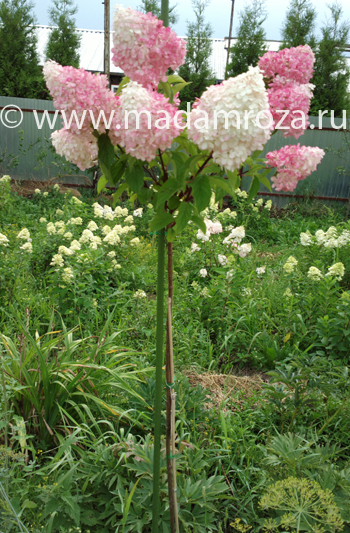 Magical Starlight (Мэджикал Старлайт - "Волшебный Свет Звезды"). Новинка! Кусты 1,6-1,8м высотой, крепкие, не требуют подвязки, побеги прочные с красным оттенком. Соцветие конусовидное, воздушное, с очень большими цветками (6-8 см), похожими по форме на звезды. Цветение очень красивое, привлекает внимание своей романтичностью. Этот сорт прекрасно соцетается с любыми многолетниками и кустарниками. Цветение длительное, с середины июня до конца сентября. В НАЛИЧИИ: Размеры саженцев: контейнер 10 литров (60-80 см) - 2500 рублей