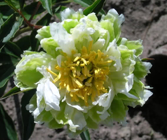 Cheddar Surprise (Чеддар Сюрпрайз. Цветок махровый, бомбовидный, крупный. В начале цветения плоский, с несколькими рядами белых лепестков и желтыми тычинками в центре, затем вырастающая корона из белых лепестков перекрывает желтые тычинки. Очень необычный! Стебли мощные, высота куста 90 см, диаметр цветка 15-20 см. Срок средне-поздний. В НАЛИЧИИ: корень 3-5 почек в контейнере - 2700 рублей